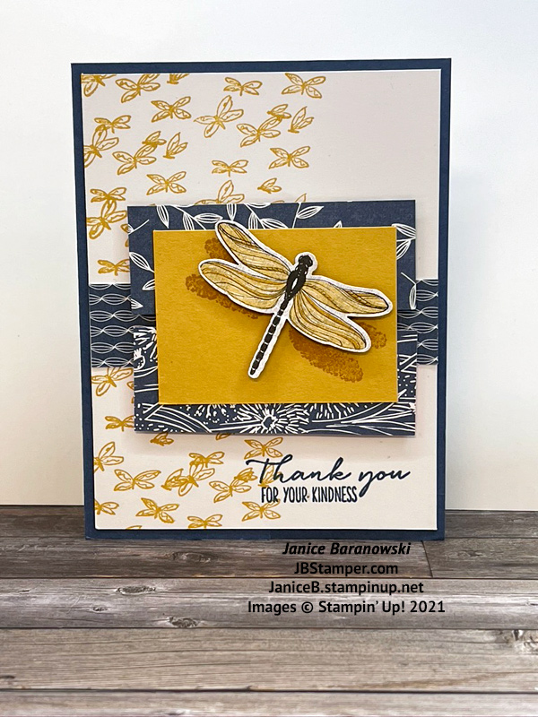 Today’s three cards were actually the first 3 I made using the Dandy Garden suite during Stampin’ Up!s virtual OnStage at home in November. We were able to purchase this was the stamp set to participate in a “Mystery Stamp.” Have you ever heard of or participated in a Mystery Stamp? I’ve just recently started participating in several of these. You are given a list of card pieces, sizes to cut and supplies you need, then during the virtual event you are given steps, one at a time, to make the card. Of course, you have no idea what the leader’s card looks like until the end. It’s always fun to see what others’ cards looks compared to yours. Each are very unique, and really sparks your creativity interpreting the list of supplies and directions! I’m planning on adding a Mystery Stamp on my JB Stamper Facebook page, so watch for the announcement!