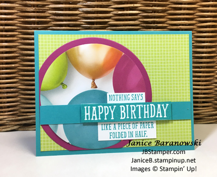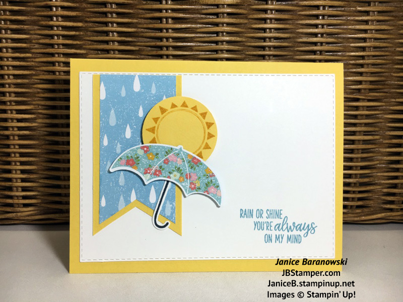 I needed a quick, cheery card on a dreary, but warm Sunday afternoon. The FMS424 challenge template was the perfect solution. Using my “Under My Umbrella” stamp set, the Umbrella Builder punch and the matching “Pleased as Punch” DSP made it easy. I started with a Daffodil card base, added a Whisper White layer die […]