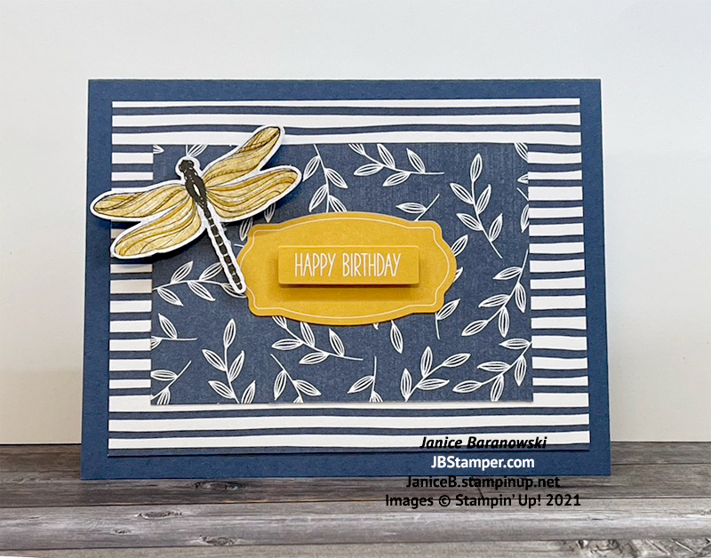 My second card uses a Misty Moonlight card base and a few pieces of the Dandy Garden DSP with two labels from the Dandy Garden Memories & More card pack. The Bumblebee color label and “Happy Birthday” tag come from the enclosed sticker sheets. Another punched out large dragonfly, this time in the Bumblebee color.