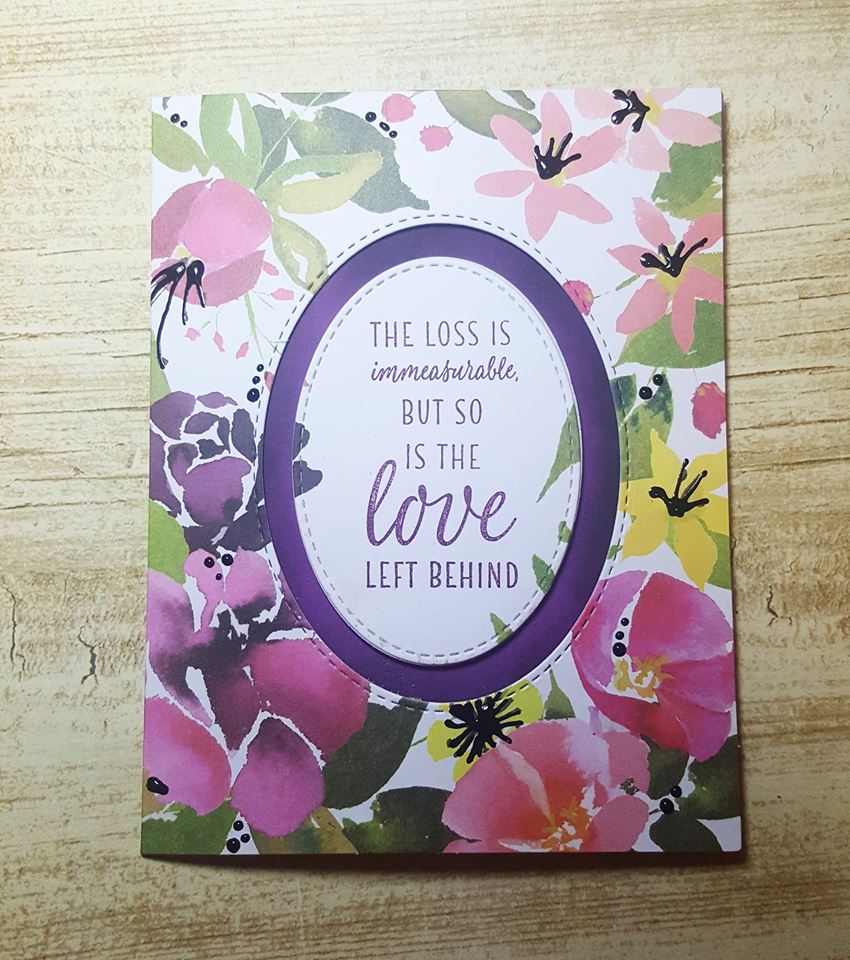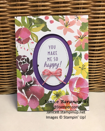 I used the two largest ovals from the Stitched Shapes framelits to cut the center out of the card front. Save that small, leftover oval frame piece (where you now see the Gorgeous Grape), it will show up on another card!