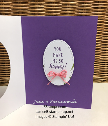 On the inside I adhered a piece of Gorgeous Grape cardstock cut to 5-1/2″ x 4-1/4″. Then with the card closed I placed the greeting oval with dimensionals in the middle of the cutout on the front. So that when you open it up, here’s what you see.
